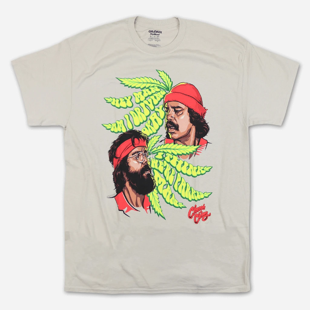 A men’s traditional fit 18/1 cotton tee featuring a Cheech & Chong graphic on front.