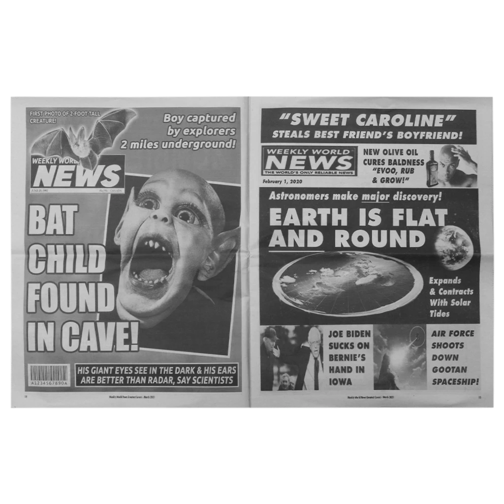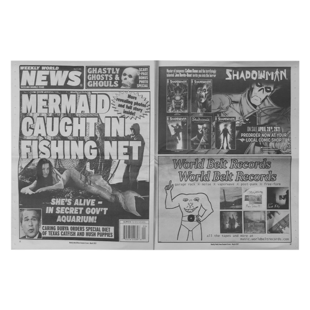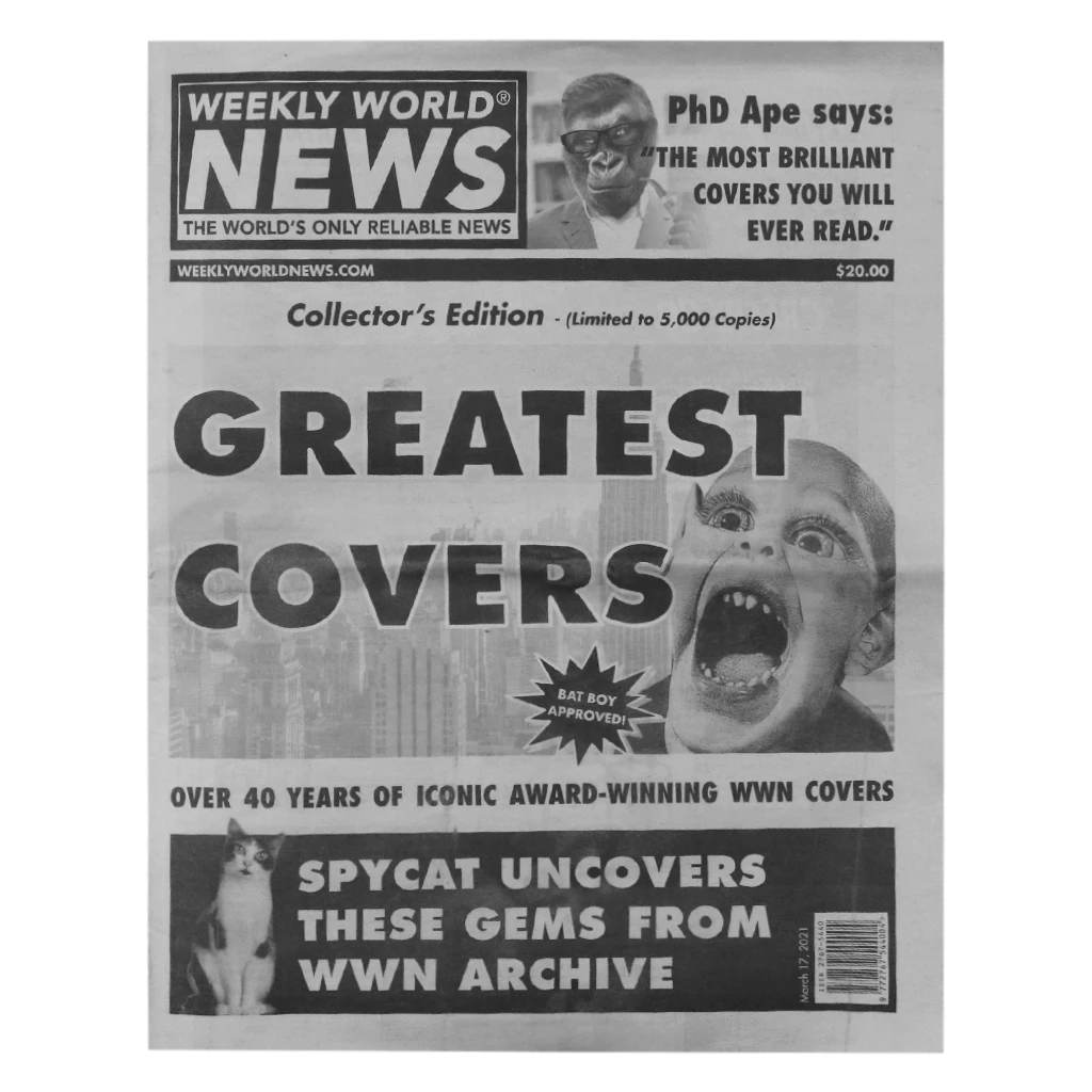 Weekly World News Greatest Covers is the first printed WWN tabloid edition in 15 years!!! It is stuffed with iconic WWN cover stories plus ads for a total of 56-pages of exceptional tabloid fun!